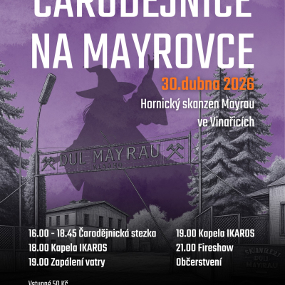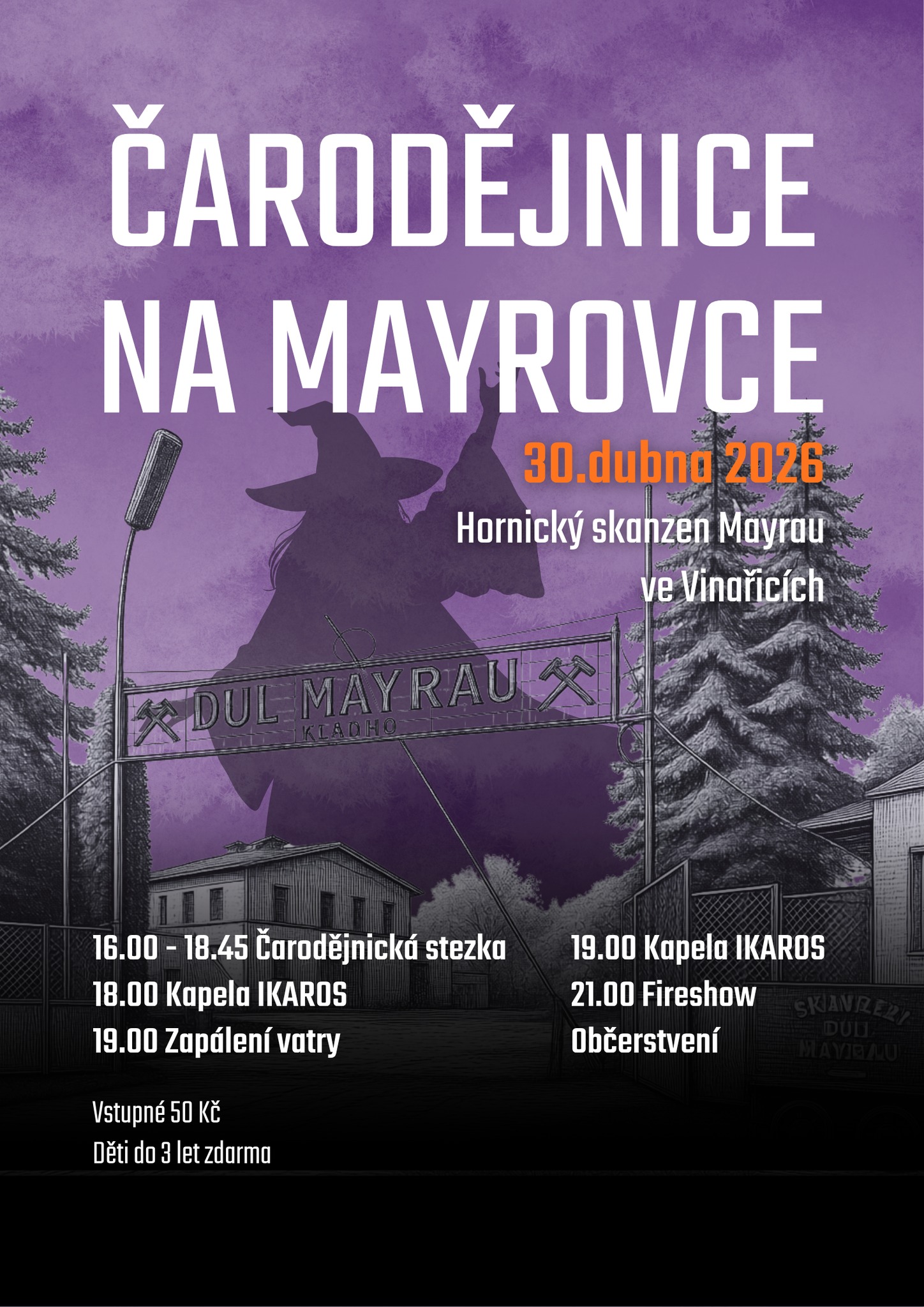 Kdo má chuť vyrazit kousek za město, může zamířit na Čarodějnice na Mayrovce do Hornického skanzenu Mayrau ve Vinařicích. Tam program začíná od 16 hodin čarodějnickou stezkou pro děti, od 19 hodin se má zapálit vatra, zahraje kapela Ikaros a večer doplní fireshow J. Václavoviče. Industriální prostředí bývalého dolu tomu navíc dává atmosféru, kterou obyčejná louka u hřiště prostě neumí.
