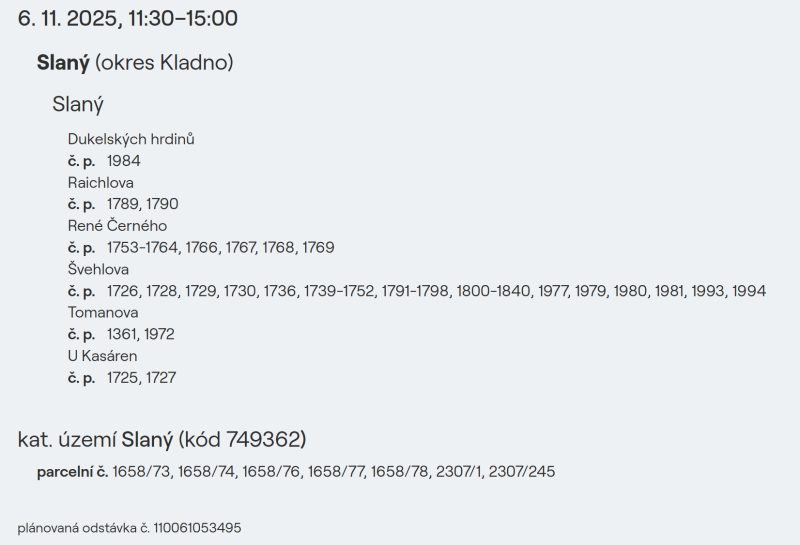 Ve čtvrtek 6. listopadu si Slaný na pár hodin osvěží, jaké to je, když svět patří tichu, svíčkám a rozbitým budíkům. ČEZ Distribuce totiž od 11:30 do 15:00 plánuje vypnout elektřinu v několika částech města, prý kvůli údržbě a modernizaci sítě. Jinými slovy, budou si šroubovat svoje dráty, zatímco obyvatelé Dukelských hrdinů, Raichlovy, René Černého, Švehlovy, Tomanovy a U Kasáren si dají nucenou pauzu od civilizace.
