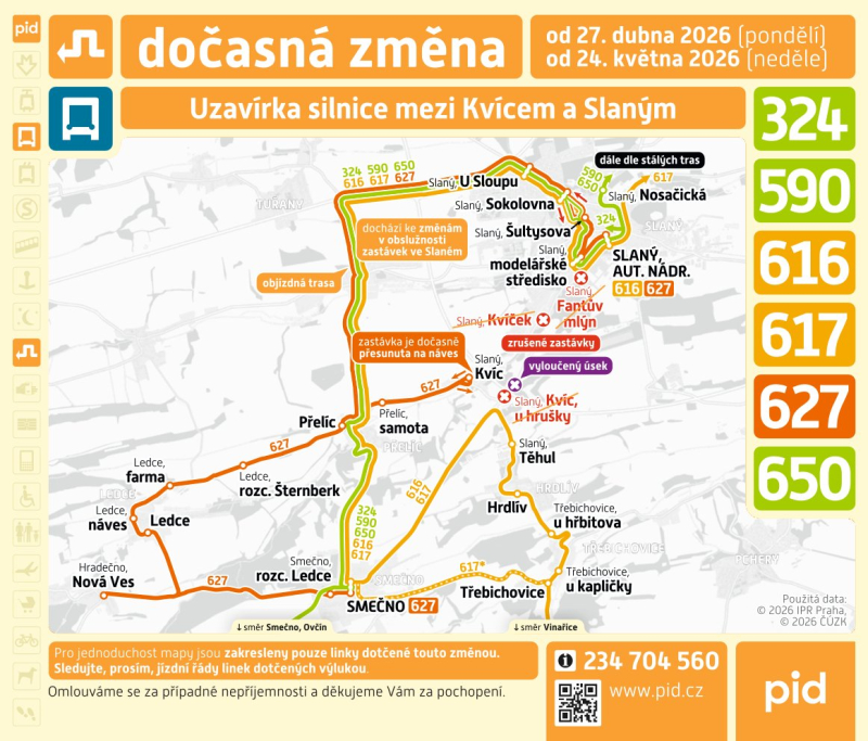 Od pondělí 27. dubna do neděle 24. května 2026 musí řidiči i cestující počítat s uzavírkou silnice II/118 mezi Slaným a místní částí Kvíc. Konkrétně se jedná o úsek mezi kilometry 93,067 až 93,385. Současně dojde také k omezení na silnici III/23639. Důvodem jsou stavební práce.
