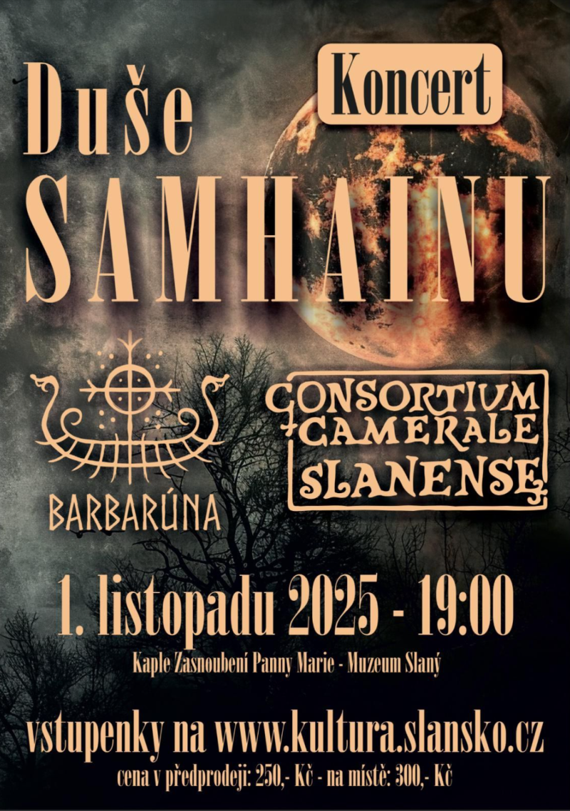 A právě na tuto starou keltskou tradici naváže koncert Duše Samhainu, který se uskuteční 1. listopadu 2025 od 19 hodin v kapli Zasnoubení Panny Marie v prostorách slánského muzea. Vystoupí soubory Consortium Camerale Slanense a Barbarúna, jejichž hudba propojí keltské kořeny s duchovní atmosférou tohoto svátku.