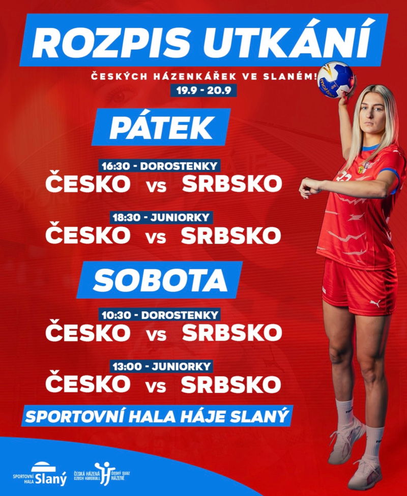 Do Slaného se po delší době vrací vrcholová mezinárodní házená. Sportovní hala Háje bude v pátek 19. a v sobotu 20. září hostit dvojzápasy českých dorostenek a juniorek proti reprezentaci Srbska. Diváci se mohou těšit na dvě utkání každý den – v pátek od 16.30 nastoupí dorostenky a od 18.30 juniorky, v sobotu pak program pokračuje dopoledním blokem.