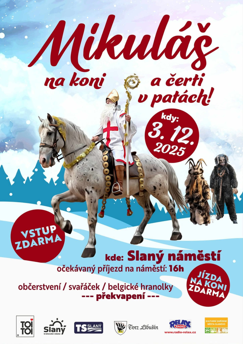 Ve Slaném se chystá mikulášská podívaná, která městu přiveze atmosféru starých adventních průvodů i pořádnou dávku koní. Na Masarykovo náměstí dorazí 3. prosince kolem šestnácté hodiny Mikuláš na koni se svou družinou, letos navíc poprvé v doprovodu jezdců z Tvrze Libušín.
