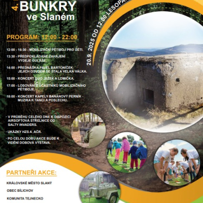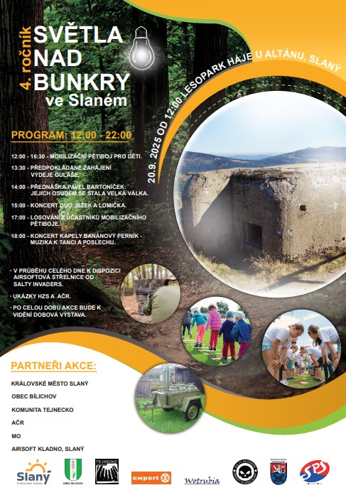 Slaný se totiž už poosmé připojí k celorepublikové vzpomínkové akci Světla nad bunkry, která připomíná mobilizaci v roce 1938. Jenže místo povolávacích rozkazů letos čekejte soutěže pro děti, ukázky dobrovolných hasičů a armády, odbornou přednášku a odpolední i večerní koncerty – od dua Ježek a Lomička až po kapelu Banánový perník.
