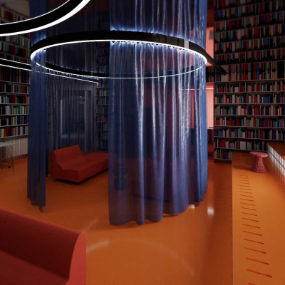 Vzhledem k tradiční dispozici historické budovy, která je velice uzavřená a rozdělená na jednotlivé místnosti s chodbami, jsou prostory členěny pomocí barev. Ústřední oddělení knihovny mají přidělenou primární barvu, která bude propojena s informačním systémem budovy pro snadnější orientaci. Nové interiérové prvky a materiály budou po rekonstrukci budovy jasně definované a rozlišitelné od původní historické struktury. Tyto nově vložené elementy jsou navrženy tak, aby budoucím uživatelům umožňovaly celou škálu využití, které současná budova knihovny může městu nabídnout.
