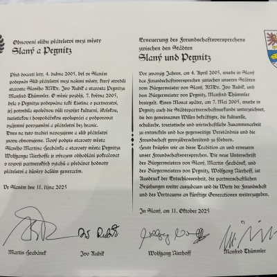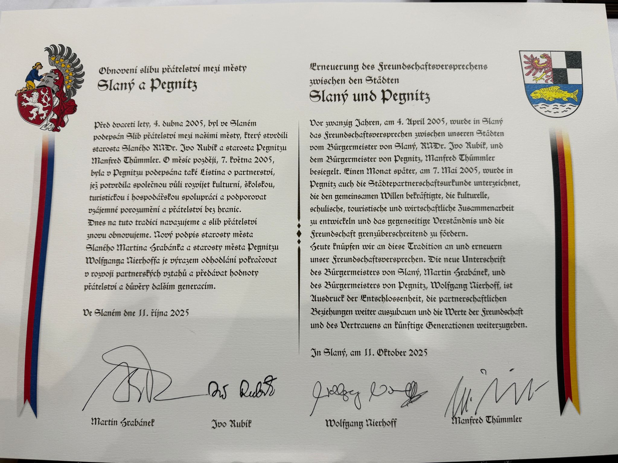 Večerní program vyplnili žáci 2. a 3. ZŠ Slaný. Zazpívali tak, že i protokol na chvíli roztál. A pak přišel okamžik, kvůli kterému dorazily kravaty, saka a fotografové – znovupodepsání partnerské smlouvy s městem Pegnitz. Původní byla podepsána 7. května 2005, takže si oficiálně připomínáme 20 let partnerství. To už je skoro jako manželství – společná setkávání, občasné výjezdy, drobné kulturní rozdíly a pevné pouto.