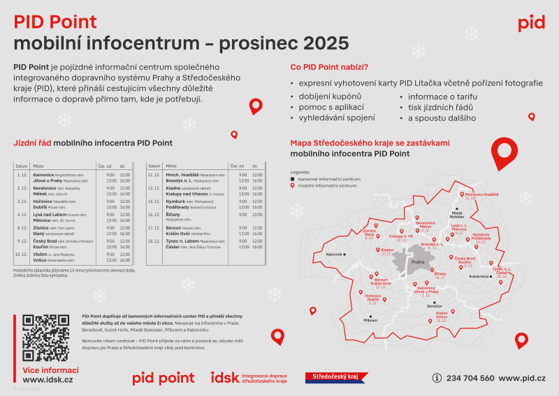 Mobilní informační centrum PID vyrazí v pondělí 8. prosince na dvojitou misi. Dopoledne od 9 do 12 hodin bude stát ve Zlonicích, odpoledne od 13 do 16 hodin se přesune na autobusové nádraží ve Slaném. Den ideální pro všechny, kdo své lítačkové resty úspěšně odkládali až doteď.