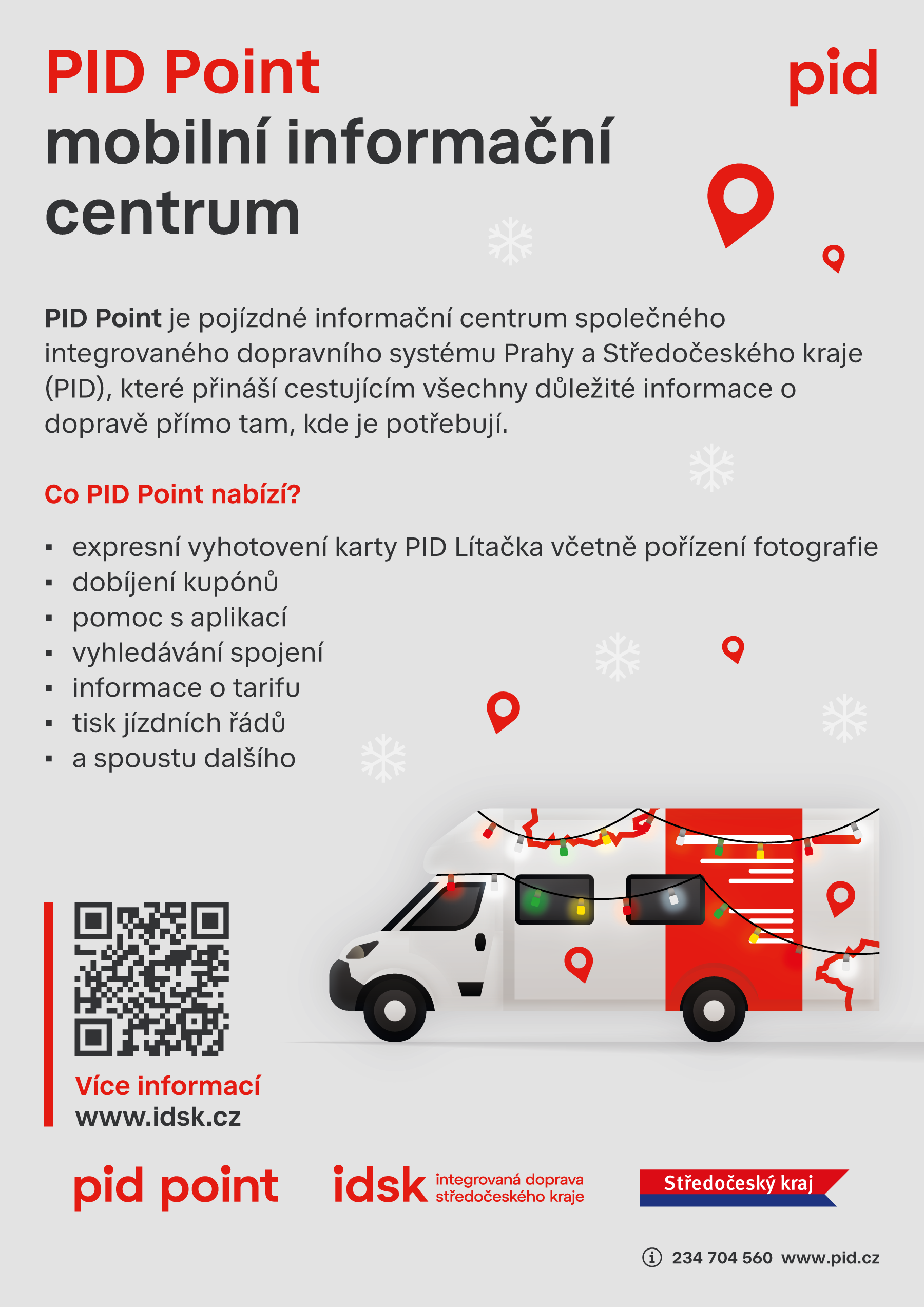 Mobilní informační centrum PID vyrazí v pondělí 8. prosince na dvojitou misi. Dopoledne od 9 do 12 hodin bude stát ve Zlonicích, odpoledne od 13 do 16 hodin se přesune na autobusové nádraží ve Slaném. Den ideální pro všechny, kdo své lítačkové resty úspěšně odkládali až doteď.