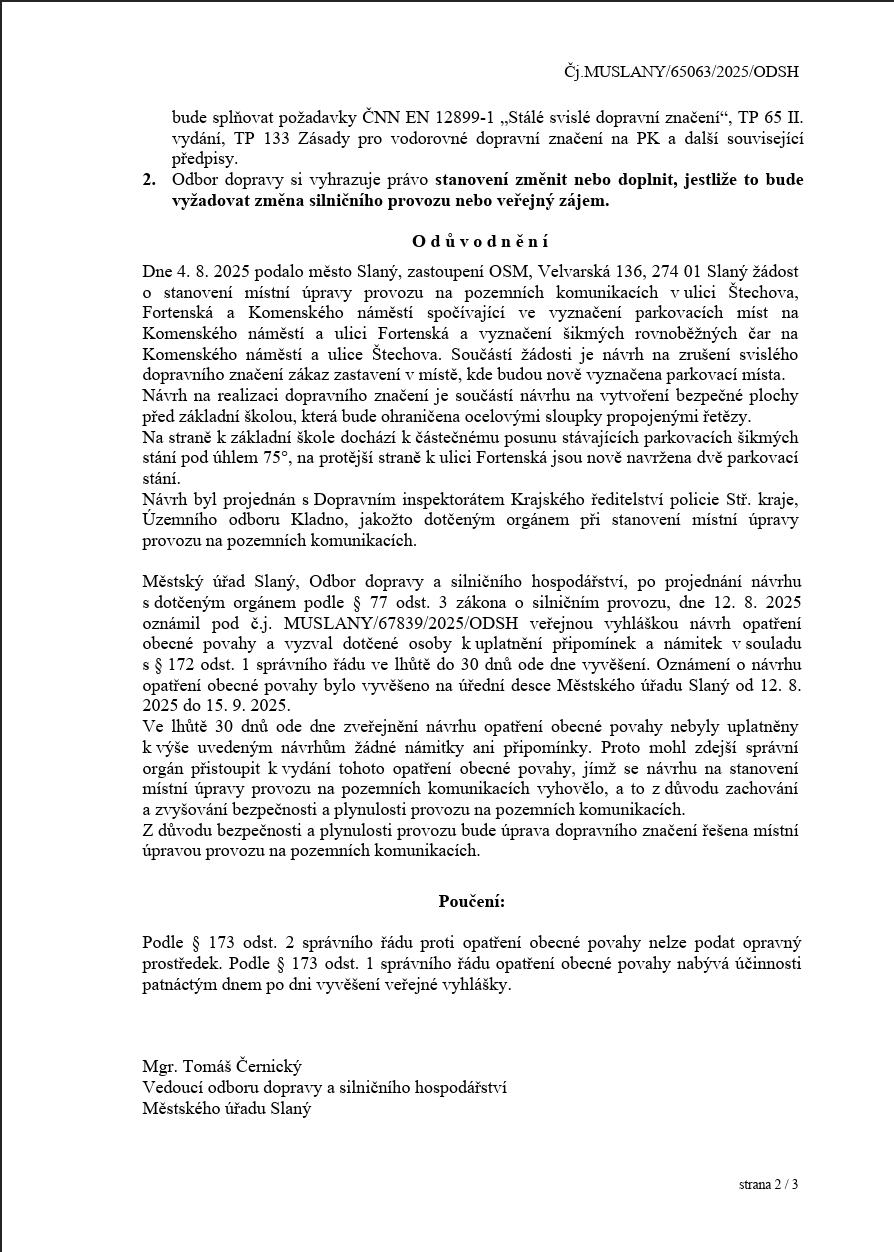 Město Slaný oznámilo změny veřejnou vyhláškou vyvěšenou na úřední desce. Podle ní se má prostor před základní školou na Komendě proměnit v bezpečnější zónu – s novým parkováním, čárami a ocelovými řetězy, které mají chránit školáky před auty. Úřad tomu říká zklidnění dopravy. Rodiče tomu pravděpodobně začnou říkat „zóna, kde už fakt nikde nezaparkuju“.