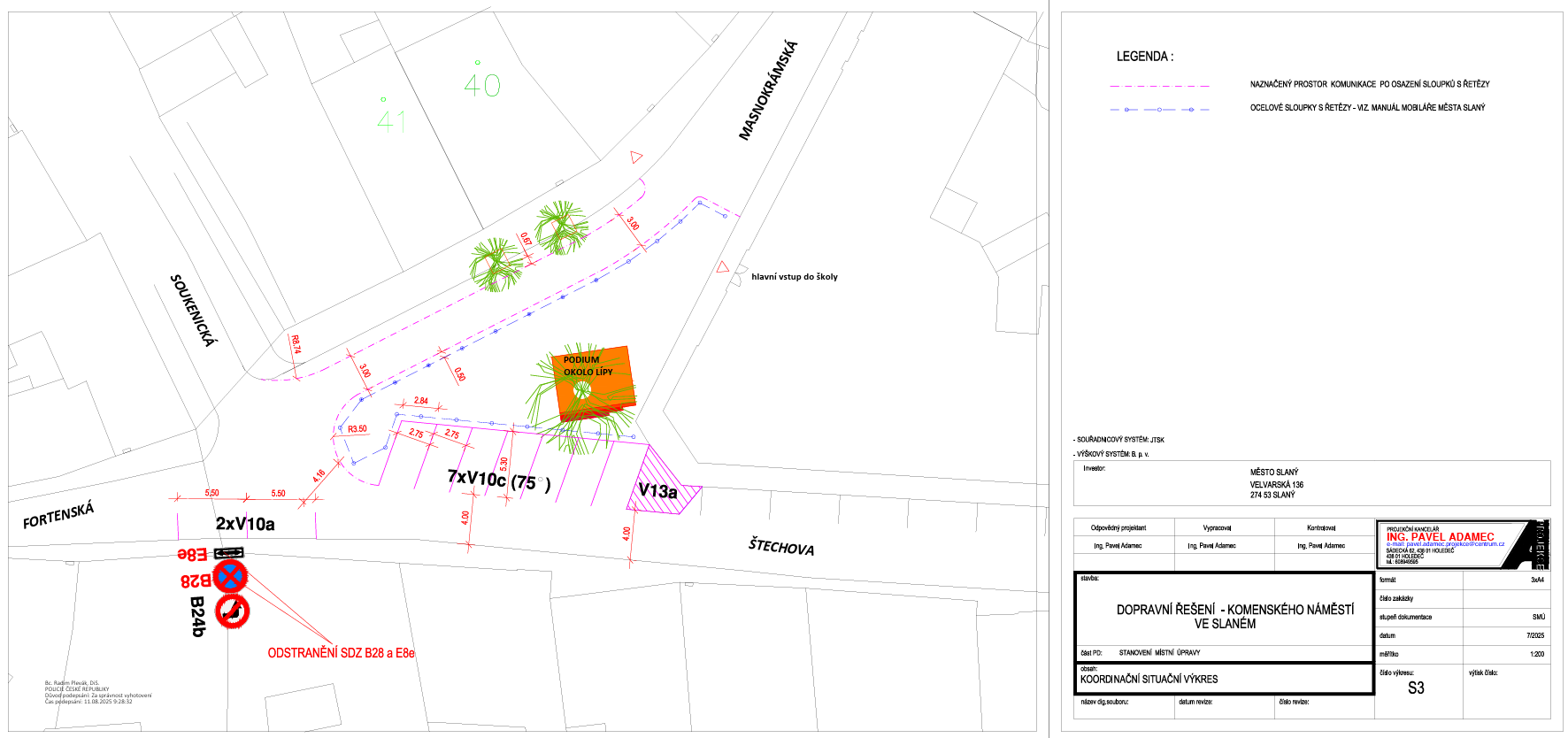 Nové opatření se týká Komenského náměstí, Fortenské a Štechovy ulice. Cílem je, aby doprava konečně vypadala tak, jak si ji představují lidé, co čtou technické normy k snídani. V praxi to znamená nové čáry, šikmá stání, úhly 75°, dvě nová parkovací místa a zrušení „zákazu zastavení“ tam, kde teď všichni stejně zastavují.
