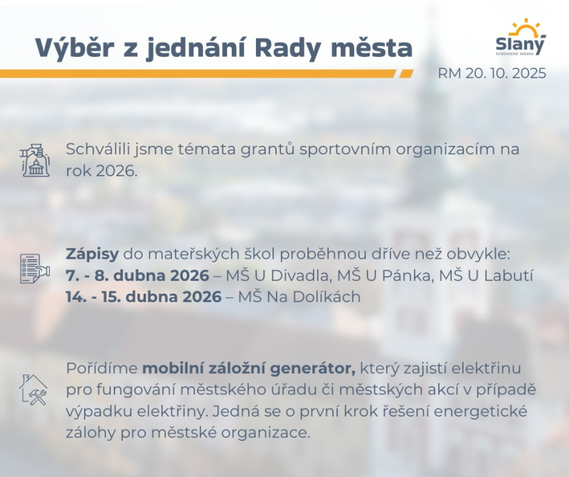 Rada města Slaný se v pondělí 20. října sešla k pravidelnému jednání a podle oficiálního facebookového příspěvku se řešily hned tři zásadní oblasti – sport, školky a energetika. Rada schválila témata grantů pro sportovní organizace na rok 2026, určila termíny zápisů do mateřských škol (už na začátku dubna, takže rodiče mohou začít trénovat přihlášky) a rozhodla o pořízení mobilního záložního generátoru, který má městu pomoci při výpadcích elektřiny.