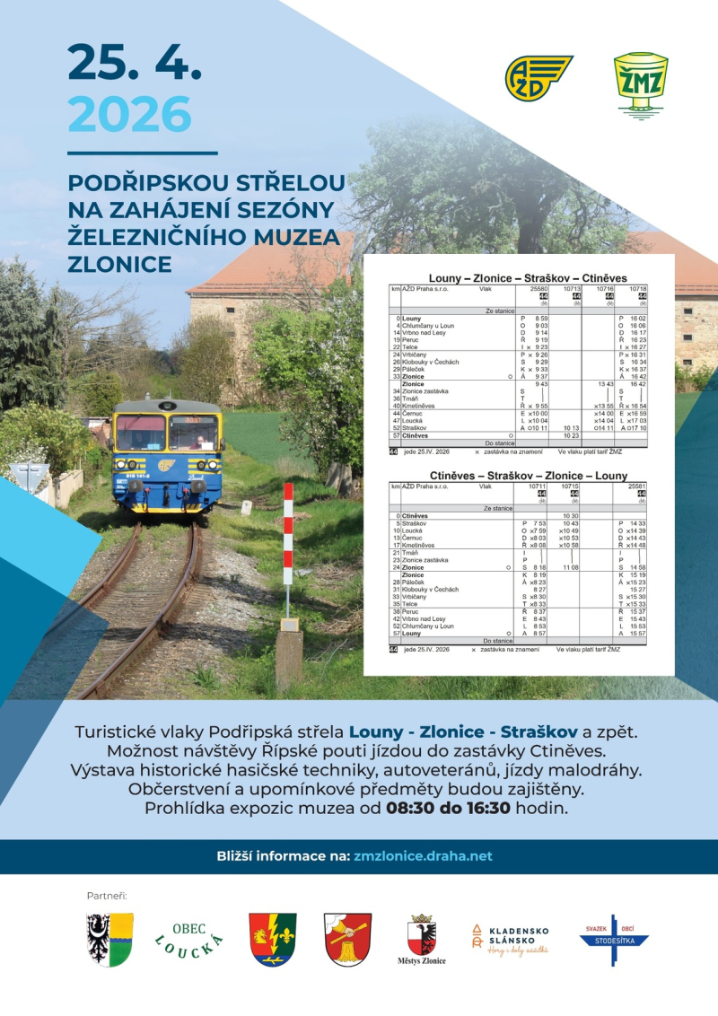 Plakát zároveň přináší i jízdní řád zvláštních vlaků, takže kdo chce vyrazit opravdu po kolejích, může si cestu naplánovat předem. Z Loun vyjíždí spoje ráno i odpoledne, stejnou možnost nabídne i cesta zpět ze směru Ctíněves, Straškov a Zlonice. Ve vlaku bude navíc platit tarif ZMZ.